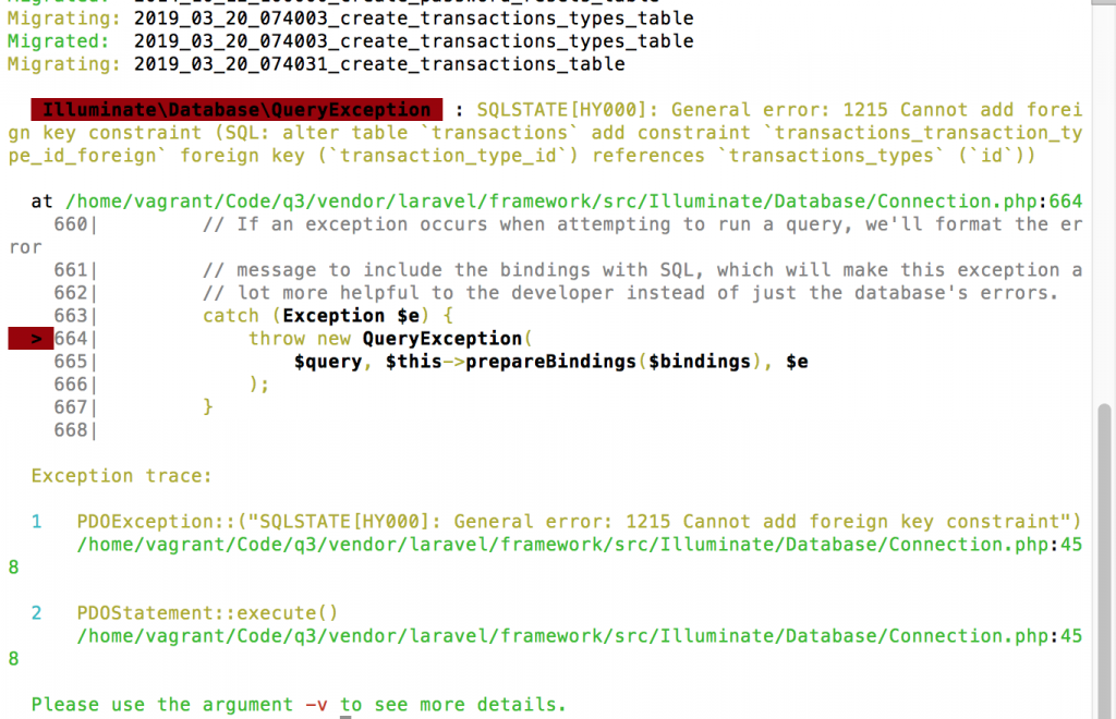 And then tried to create a migration for transactions table with a foreign key, with same syntax I used to do all the time:
