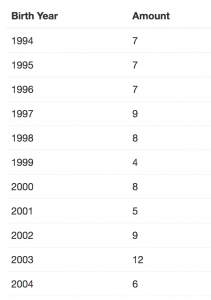 Now we're getting to the "trick" of the article. How to group by condition of "born before or after 2001 year"? So result would return two rows. Here's the code: