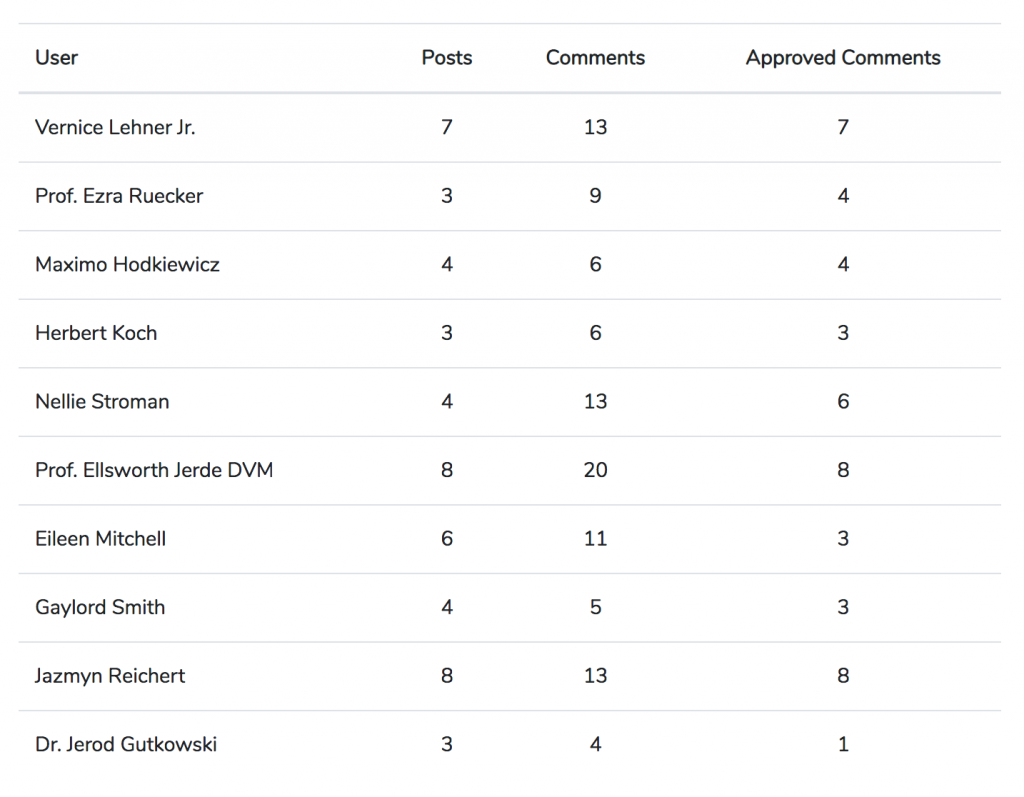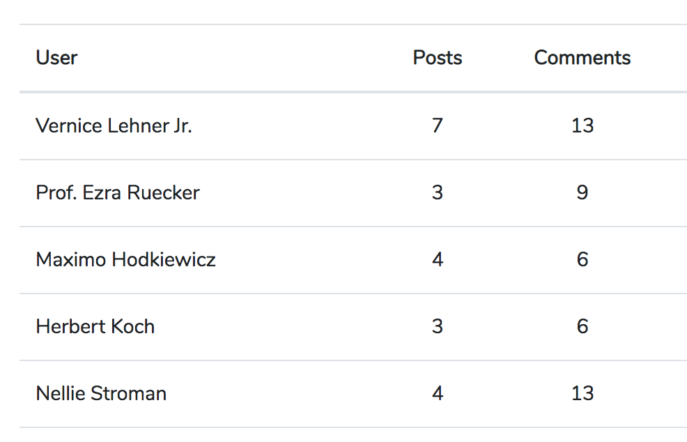 Now, we will try to show this table - the list of users and the amount of their posts/comments: