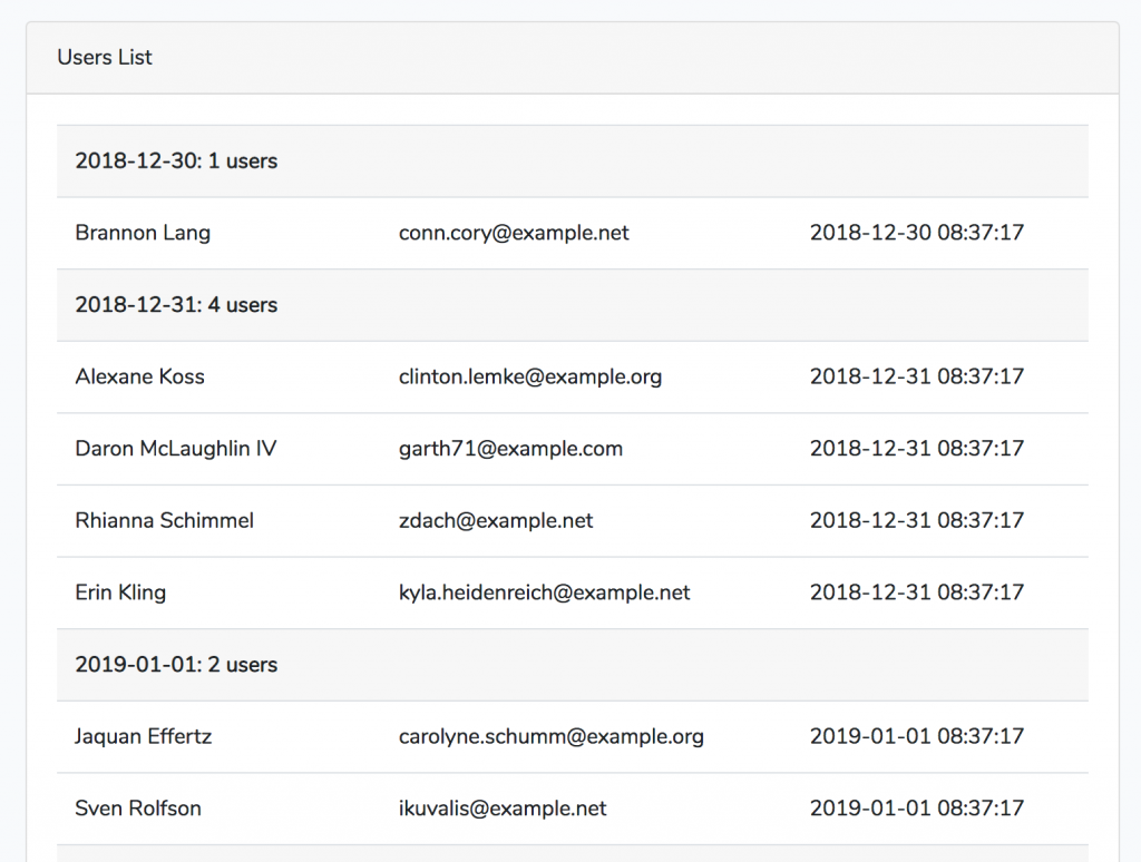 As you can see, it's a list of users grouped by their register date (or, to be precise, users.created_at column).