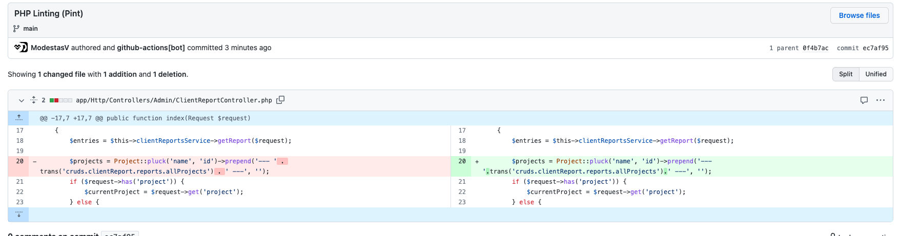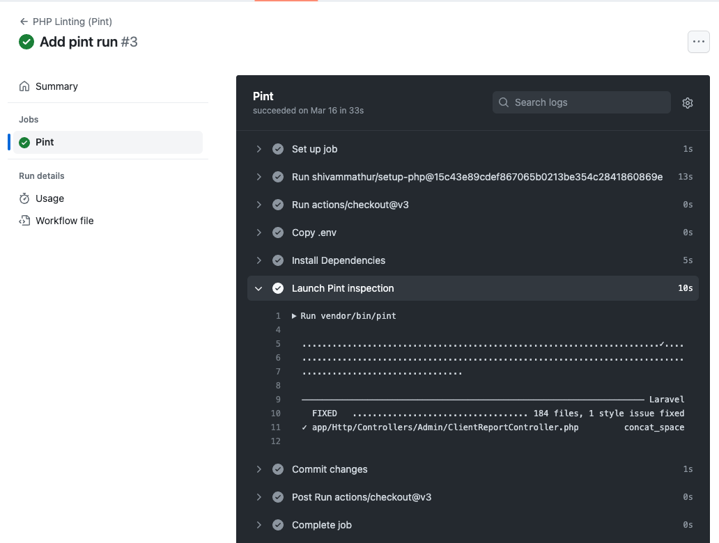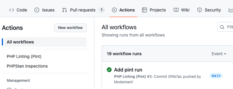 actions/checkoutaction to checkout the code - Copying .env file if it doesn't exist (just in case you want to do more than just Pint with this job)