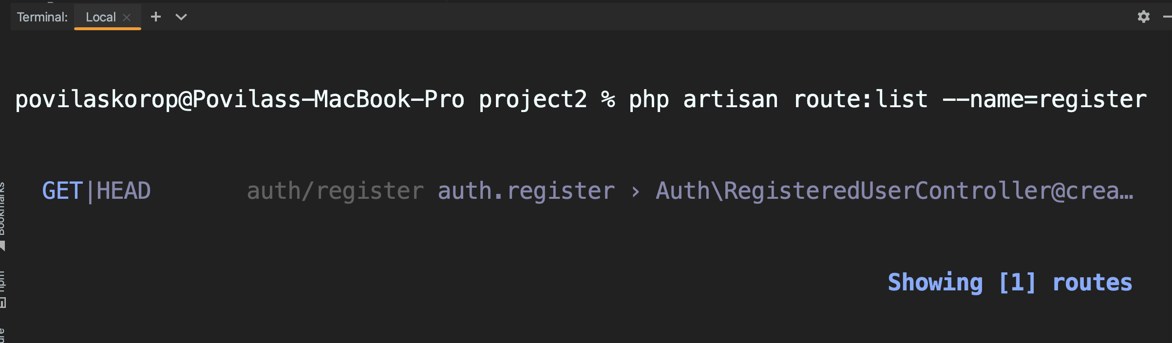 It will show you all the routes in your project, and if you find "register", you may find that the real full route name is auth.register:
