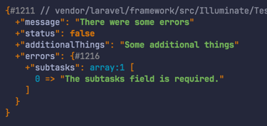 use Illuminate\Http\JsonResponse;use Illuminate\Validation\ValidationException;use Symfony\Component\HttpFoundation\Response; class CustomValidationException extends ValidationException{ public function render($request): JsonResponse { return new JsonResponse([ // This is the array that you will return in case of an error. // You can put whatever you want inside. 'message' => 'There were some errors', 'status' => false, 'additionalThings' => 'Some additional things', 'errors' => $this->validator->errors()->getMessages(), ], Response::HTTP_UNPROCESSABLE_ENTITY); }}