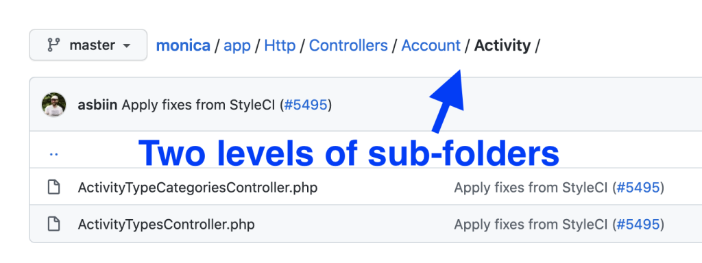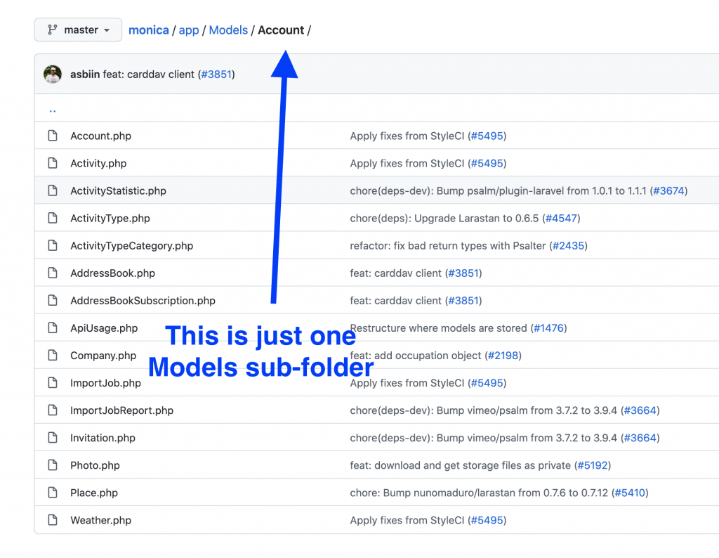 First, move things into sub-folders and namespace everything accordingly. Again, the example from the Monica CRM is pretty good.
